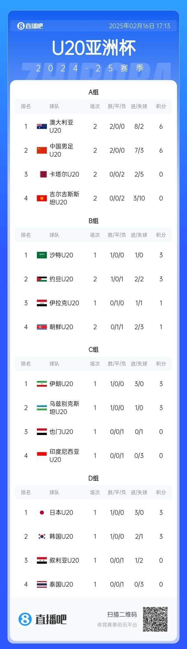 2月16日讯 北京时间今天下午进行的U20亚洲杯B组第二轮比赛,朝鲜1-2不敌约旦,两轮过后仅积1分。