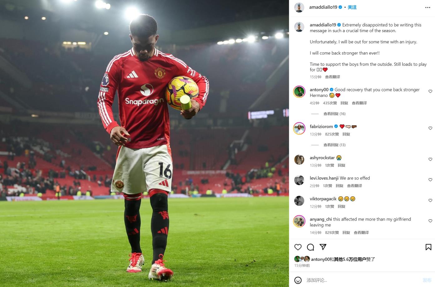 阿玛德写道:在赛季如此关键的时刻写下这段话,我感到非常失望。不幸的是,我将因伤缺阵一段时间。复出时我会比以往更强大!!现在要在场外支持小伙子们了。我们还有很多目标要实现❤️。