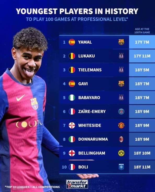 欧洲前10联赛出场100次最年轻榜:亚马尔第1,卢卡库第2